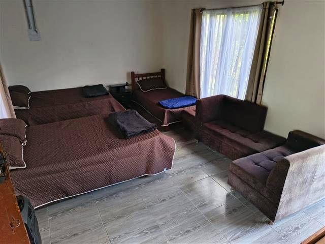 habitación con dos camas dobles, cama sencilla, baño privado, vista a la montaña.